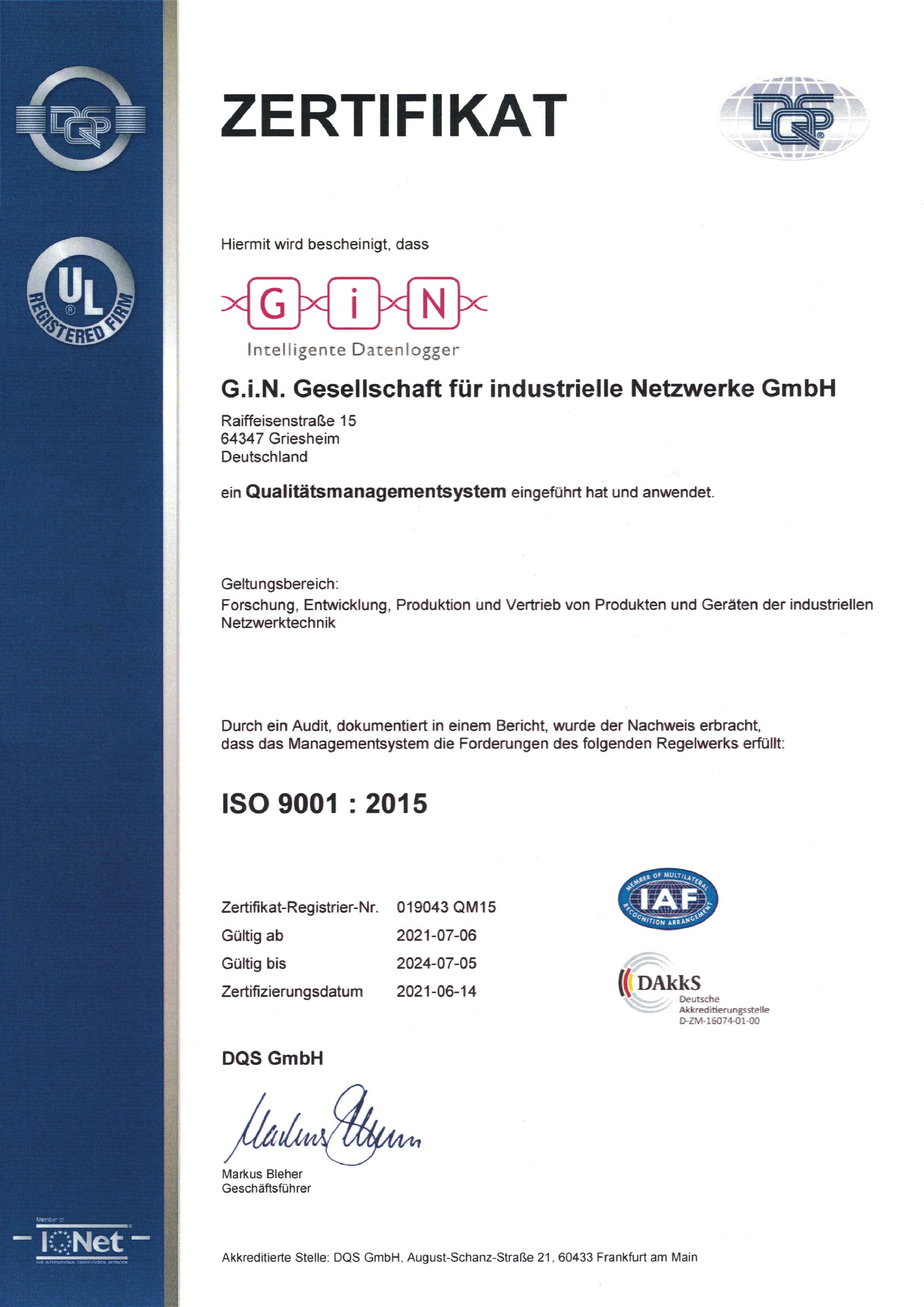 The DIN EN ISO 9001 : 2015 certification confirms that the G.i.N. GmbH introduced a quality management system which it uses for the following areas: