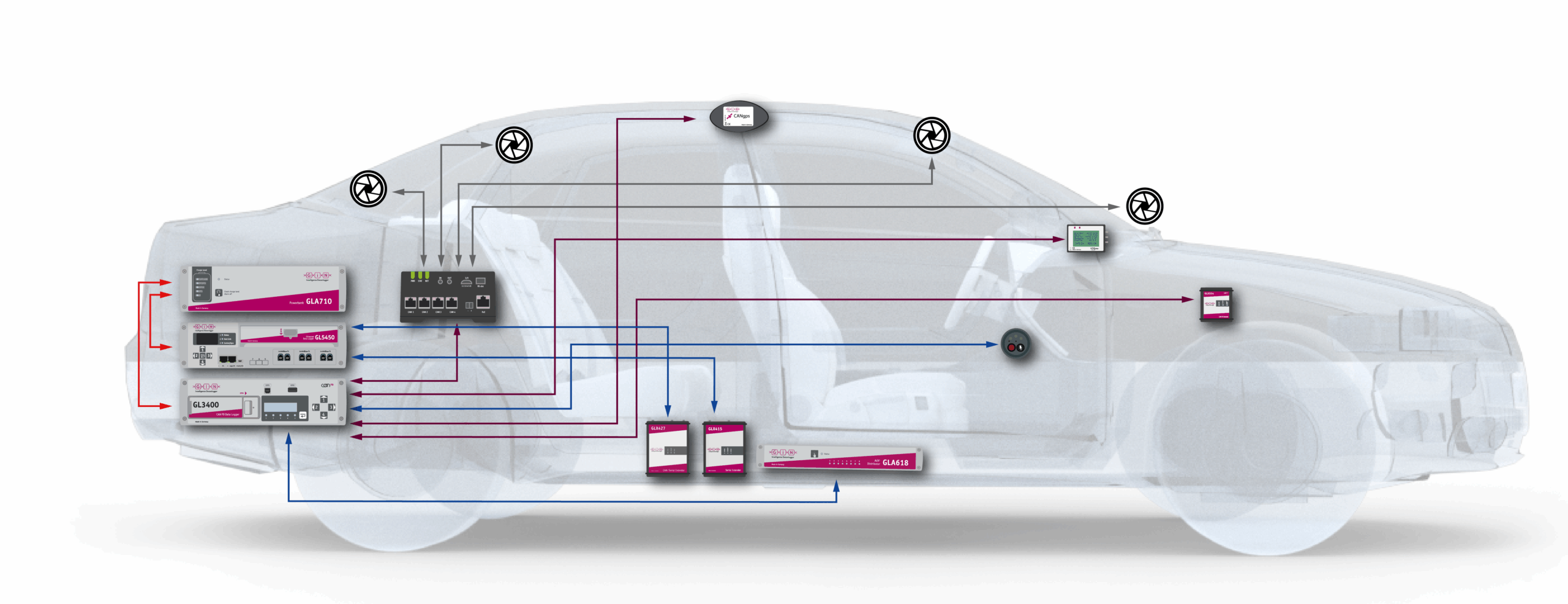 Im Verbund mit dem Automotive-Ethernet-Datenlogger GL5450 übernimmt der GL3400 die Master-Taktung und ermöglicht die zeitsynchrone Aufzeichnung von bis zu 20× 100Base-T1 (10 Taps) und 6× 1000Base-T1 (3 Taps). Der GL3400 ist außerdem mit 5 Ethernet-Schnittstellen einschließlich integriertem Switch ausgestattet und bietet neben TCP/UDP-Logging auch Ethernet-Raw-Logging sowie den zeitsynchronen Anschluss von bis zu 4 Kameras zu den Busdaten.